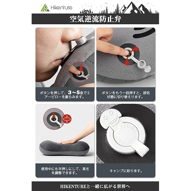 【超軽量、コンパクトに収納可能】収納袋が付属されているHikentureキャンプ枕は、 よりスマートに携帯できます。収納サイズ(15cm*7cm&手のひらサイズ)、バックパッ クの隙間でも入れ、収納スペースも取りません。空気弁を押すと、一瞬に空気抜き、 片付けもくるくると巻いていくだけと簡単です。持ち運びもしやすいので、複数そろ えてファミリーキャンプにもオススメです。