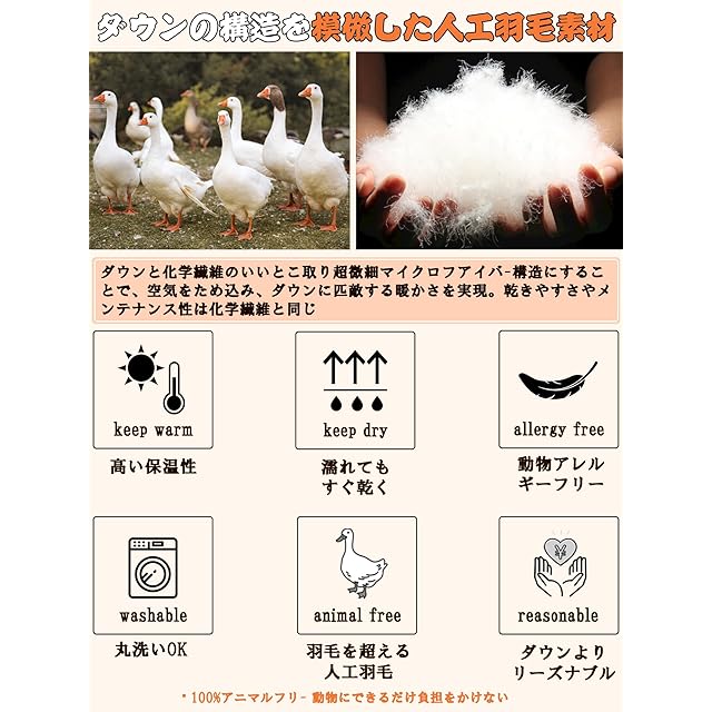 【人工ダウンの保温より】CAMDOORの寝袋動物性成分を100%含まず、環境に優しく再生可能です。人工ダウンは羽毛のように動物性たんぱく質を含まないため羽毛のようないやな動物臭がないのが特徴です。 人工ダウンの繊維構造は羽毛の繊維構造を人工的に再現し保温力と柔らかさ、軽さを実現しました。この素材は家で簡単に洗えて、ダウンと中空綿の長所を組み合わせました。保温性と通気性に優れています。市販されている同じ重さの中綿素材の寝袋よりも暖かくて柔らかいです。外気に邪魔されることなく、安心して眠ることができます。アウトドア、キャンプ、車中泊、登山、旅行、花見、災害などに最適です。動物性素材に敏感なご家族や、お子様もご使用いただけます。
