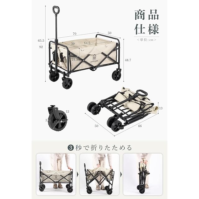 【キャリーワゴン仕様】材質:ポリエステル(本体生地 オックスフォード織)、スチール(フレーム)、PP+PVC(タイヤ) 展開サイズ:約W70×D50×H65.5~92cm 収納サイズ:約W50×D13×H66cm 内部収納サイズ:約W64.5×D39×H24.5cm 重量:約5.2kg 容量:約58L パッケージ内容:キャリーワゴン本体×1、取扱説明書×1