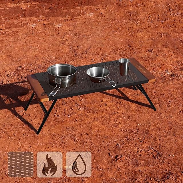 【耐久性・安定性】テーブルの天板は高強度スチールを一度にプレスして作られ、シンプルで頑丈な構造、最大耐荷重は約20kgです; テーブル全体は、錆や水、熱に強い粉体塗装で、スタイリッシュな外観と、汚れても丸洗いできてお手入れも簡単で、実用性と耐久性を兼ね備えています;テーブルの脚がC字に開くので安定感があり、薪置きやカトラリー置き、調理台としても使用できます;テーブルは耐熱・耐水性なので、鍋などの熱いものや冷凍庫、水に濡れる可能性のある食品を置くときに重宝します;2セット重ねて棚として使用することも可能です。