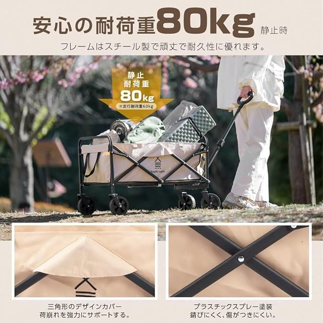 【コンパクト収納/約5.2kgの軽量タイプ】荷物の搬入後は、そのまま荷物置き場にすれば、スペースの有効活用になります。収納は、底面中央のループストラップを軽く引っ張るワンタッチ。約W50×D13×H66cmのフラットサイズに納まり、車のトランクや玄関など収納場所に困りません。重量は約5.2kgの軽量タイプ。ハンドルを手に移動も簡単。持ち運び用の取っ手付き。キャンプ以外にも、買い物をまとめて駐車場まで運ぶショッピングカートとしても便利です。