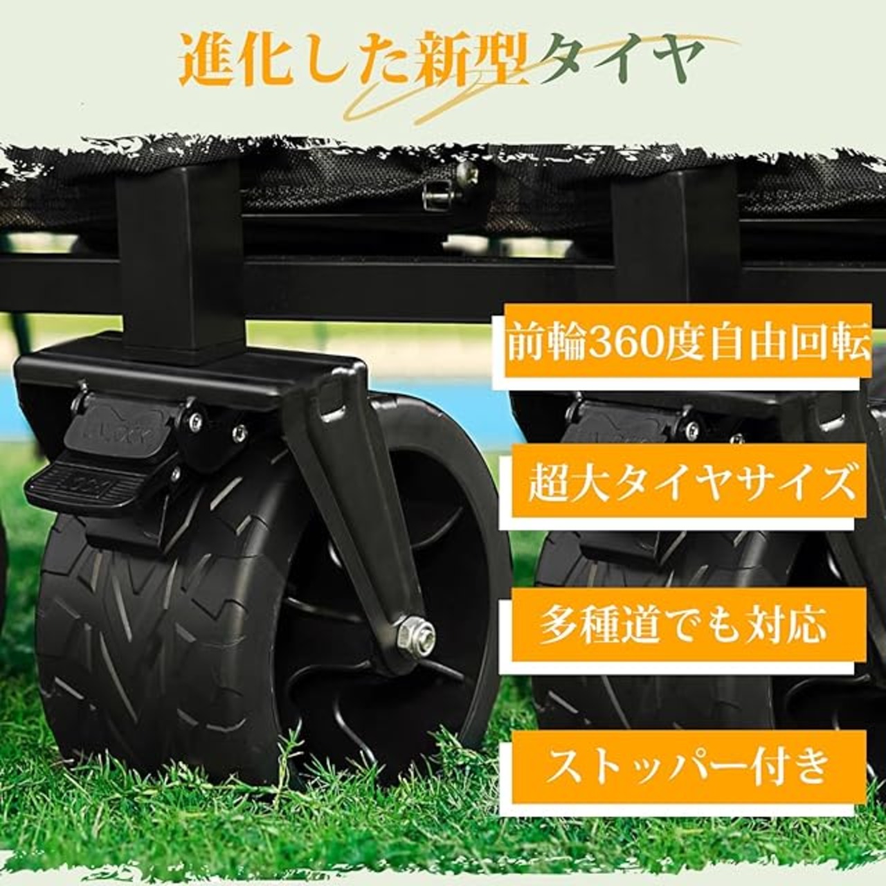 ✨【悪路でも安定するタイヤ】高強度、高スプリングバック、高耐摩耗性、高い引裂き耐性などの特性を有したポリウレタンタイヤを採用します。重い荷物をのせて段差のある場所、芝生や凸凹道、ぬかるみ、舗装路、砂利道、砂浜などでも安定して進めます。360°回転する17CMのワイドタイヤが装備されており、未舗装の道路や凹凸のある道などどんな場所でもらくに進めます。キャンプはもちろん、お釣り、運動会、お花見、BBQなど場合でも役立つでしょう。