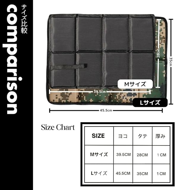 【カラバリ&2サイズ展開】ブラック・グレー・ブルー・レッド・迷彩の5色、M(39.5cm×28cm 厚み1cm)・Lサイズ(45.5×35cm 厚み1cm)から選べます。