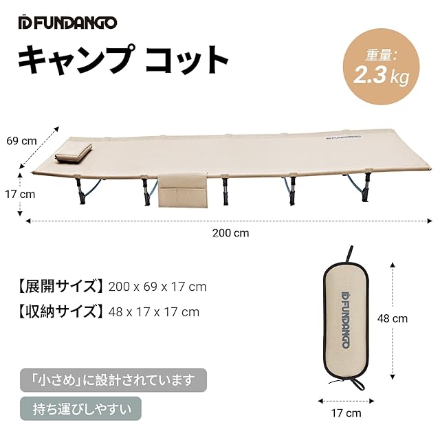 【超軽量&コンパクト収納】 FUNDANGOのキャンプ コット 軽量 はわずか2.3kgと超軽量で、収納時は48×17×17cmとコンパクト。大容量キャリーバッグ付きで持ち運びも簡単。キャンプ コット アウトドア ベッドは登山やツーリング、ソロキャンプにも最適な携帯性です。