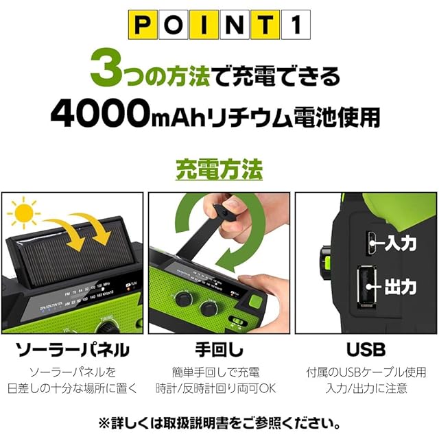 ✅【4つの充電方法】ソーラー充電、手回し充電、USB充電、リチウム電池(電池交換)