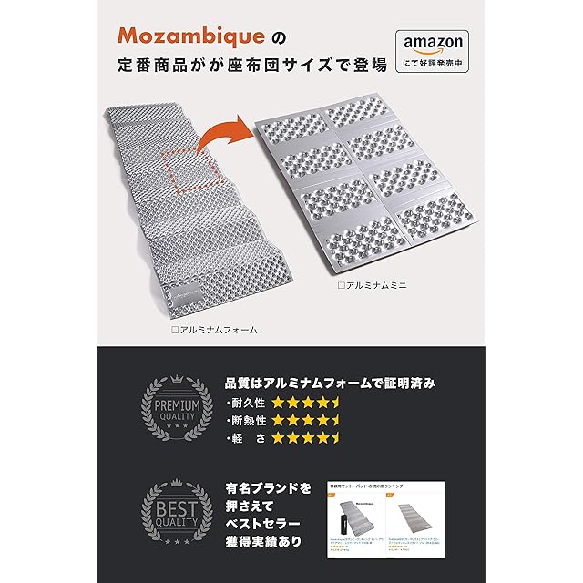 Mozambiqueの定番商品アルミナムフォームがコンパクトサイズになって登場 ・登山でちょっと休憩したい。 ・スポーツ観戦時に座り心地をよくしたい。 ・寒い時期でもおしりに冷えを感じずに座りたい。 ・防水性の高いマットを使いたい ・レジャー時にちょっと休憩したい。 座布団マットとしてはトップクラスの品質のアウトドア、キャンプの座布団マットです。