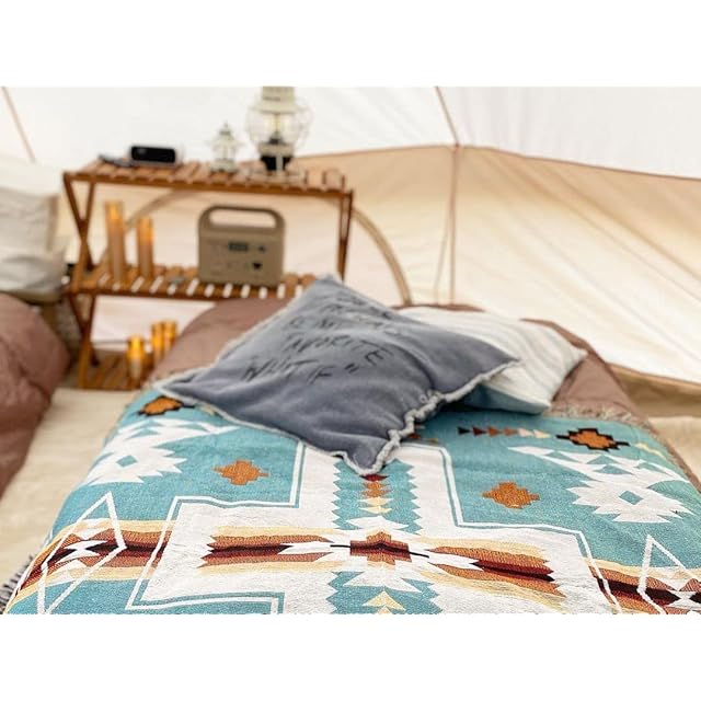 キャンプ場は山間部にあることが多いため、朝晩は冷え込みやすいです。持っていった防寒具が思っていたよりも足りず、寒い思いを経験した人も多いはず。そんなときにも、ラグが使えます!肌ざわりの良いラグを用意しておけば、あっという間に防寒具に変身。寒いシーンでは敷物として使っていたラグを、ひざ掛けや掛け布団として活用できます。 大判のメキシカンラグをコットの上に敷くだけで、まるで先住民が生活しているような空間に。ナチュラルな色あいのテントやテーブルに、メキシカンラグの派手めなデザインがマッチしています。