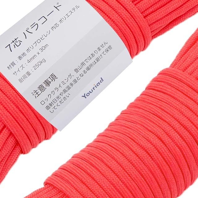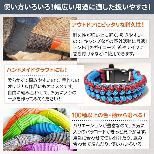 【色々な利用場所】キャンプ、アウトドア、狩猟、ハイキングおよび様々な野外活動でご利用いただけます。テントやタープのガイロープとして使用する場合は、ご利用しやすい長さでカットした後、ロープの先端はライター等で炙って(焼き止めして)ご使用下さい。外皮と内芯に異種素材を使用することで、耐摩耗性と引っ張り強度を増強します。吹雪や台風期間の荷物を固定などの場合は、数本をを束ねて利用してください。
