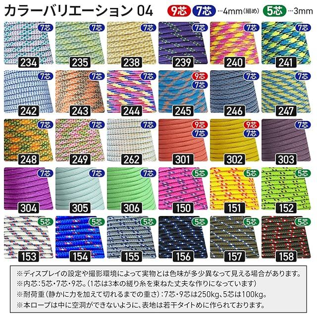 【素材】表地 ポリプロピレン、内芯 ポリエステル。 内芯:5芯、7芯、9芯(1芯は3本の縒り糸を束ねた丈夫な作りになっています)。 約 3mm ~ 4mm(太さ)×30m(長さ)/耐荷重~250kg(静かに力を加えて切れるまでの重さ)本ロープは中に空洞ができないように、表地は若干タイトめに作られております。商品によっては3 ~ 4mmもしくはそれより若干細くなっております。