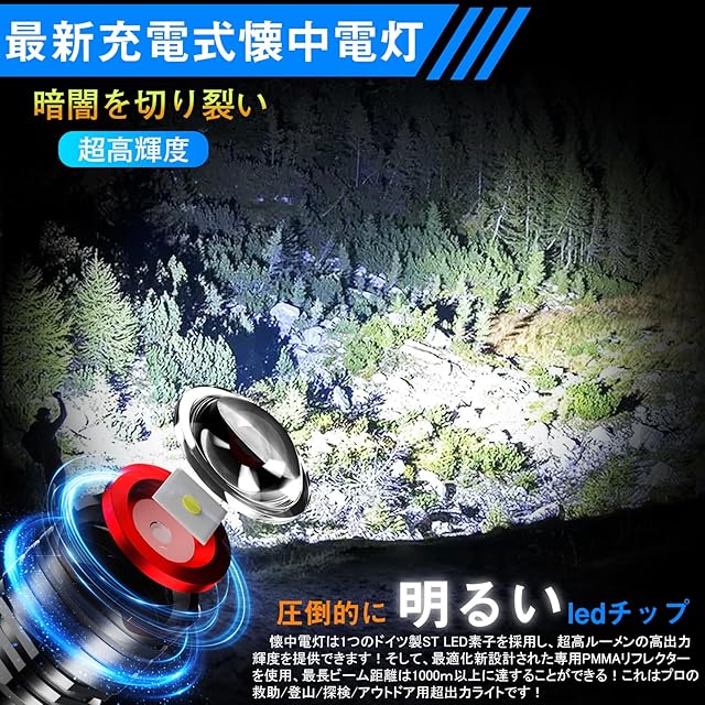 懐中電灯 led 強力 軍用 最強 超高輝度5000000ルーメン Type-C USB充電式 超長遠射 ハンディライト 明るい LED 白&赤色灯 COBライト 新型 フラッシュライト 10モード調光 ズーム式 アルミニウム合金 耐衝撃2.5M IPX7防水 登山 夜釣り 夜間訓練 作業用 停電 防災 地震 避難対策 | SMILE