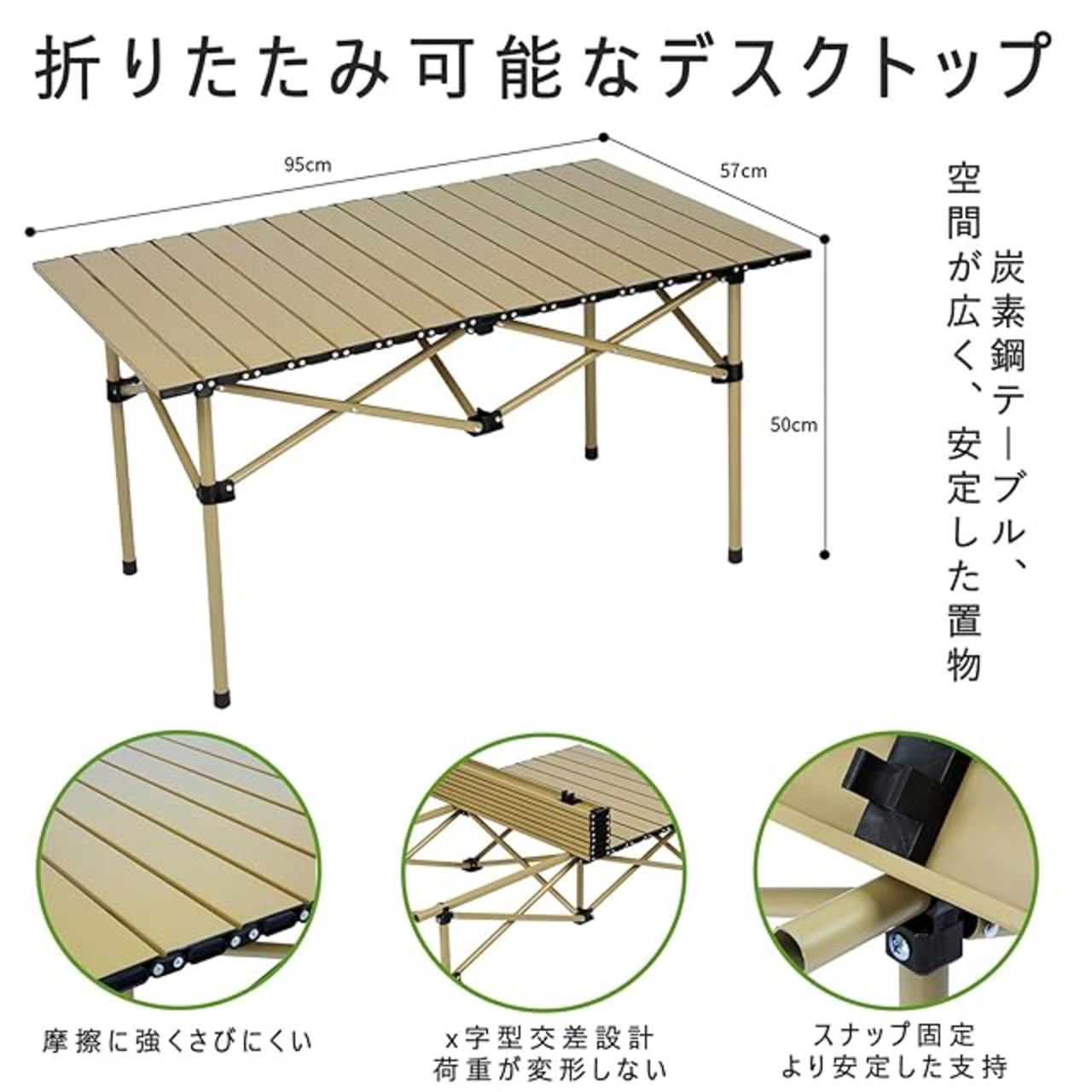 【商品仕様】アウトドア折りたたみテーブルセット[テーブル]使用サイズ:95*57*50 cm重量:4.2 kg荷重:約150 kg[椅子]使用サイズ:42*42*72 cm荷重:約150 kgセット内容:折りたたみテーブル×1、折りたたみ椅子×4。