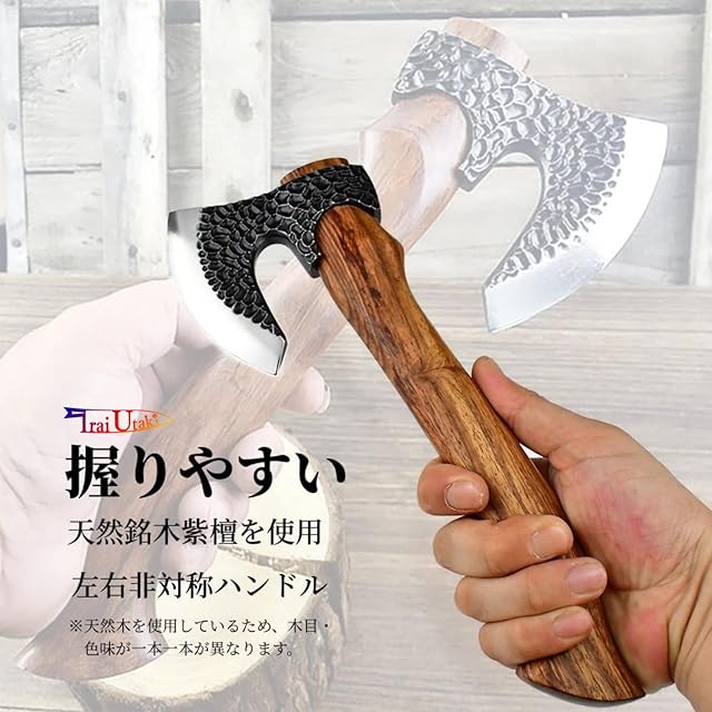 【手斧 27㎝】薪に手斧が食い込みしやすいように使われ、天然紫檀で使われたハンドルに左右非対称で、握りやすく、扱いやすいです。見た目以上に軽くてバランスがいいので、キャンプやバーベキューでの薪割りに活躍。