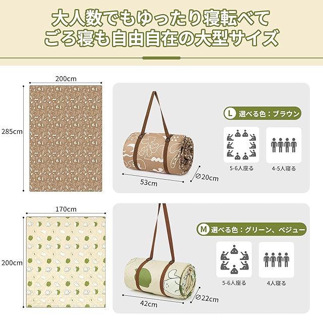 【仕様】Mサイズ:展開サイズ(200cm*170cm)、収納サイズ(φ22*42cm)、5-6人座れる、4人寝れる、重量:約1.1kg。 Lサイズ:展開サイズ(210*240cm)、収納サイズ:(φ25*42cm)、8-10人座れる、4-5人寝れる、重量:約1.5㎏。 ブラウン特有サイズ:展開サイズ(200*285cm)、収納サイズ(φ20*53cm)、8-10人座れる、4-5人寝れる、重量:約1.7kg。