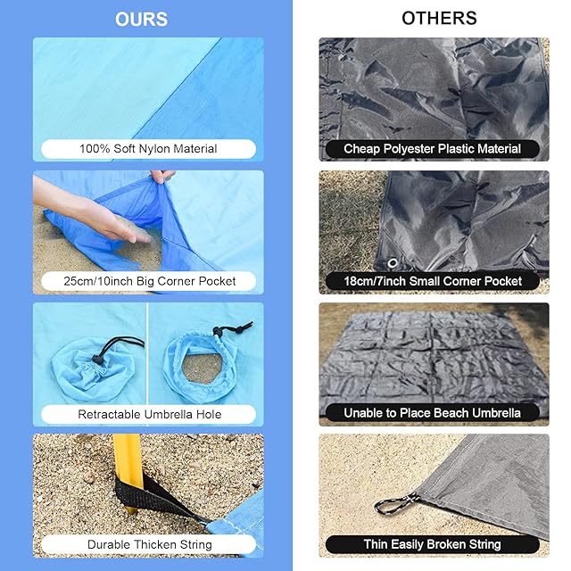 【強力な防風性能】ビーチシートの四隅にはポケットが付いており、収納や砂を詰めることができます。25cmの大きなポケットはより多くの砂を入れることができ、強風でもしっかり固定します。4つのプラスチック製ペグが付属しており、さらに固定を強化し、泥や草地でも使用可能です。