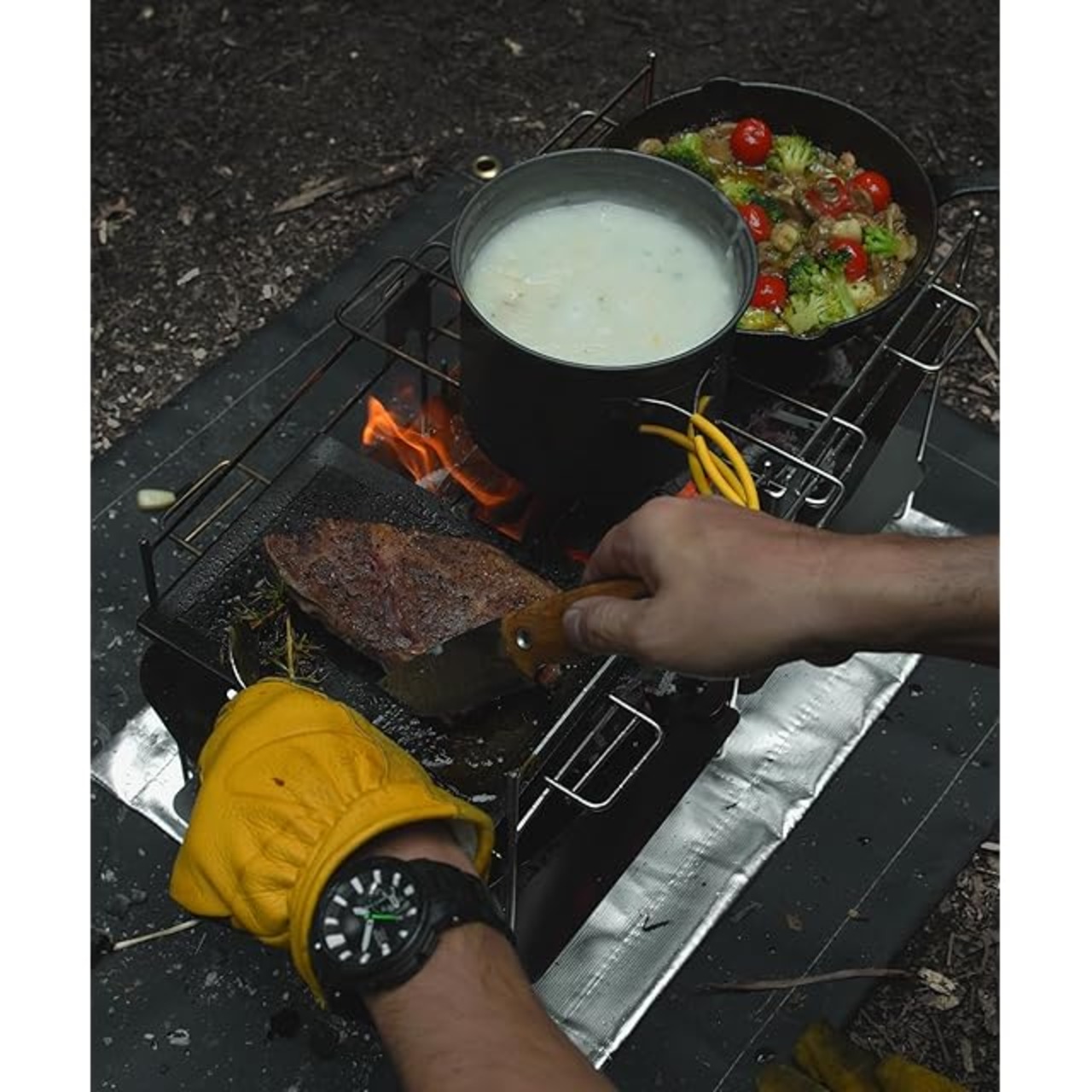 【焚き火も料理も楽しめるサイズ】広さを活かして右側で調理、左側は保温スペースにするなど使い分けることができます。付属の五徳(2本)は2段階の高さに設置することができるため、さらに細かく強火と弱火の調整が可能です。