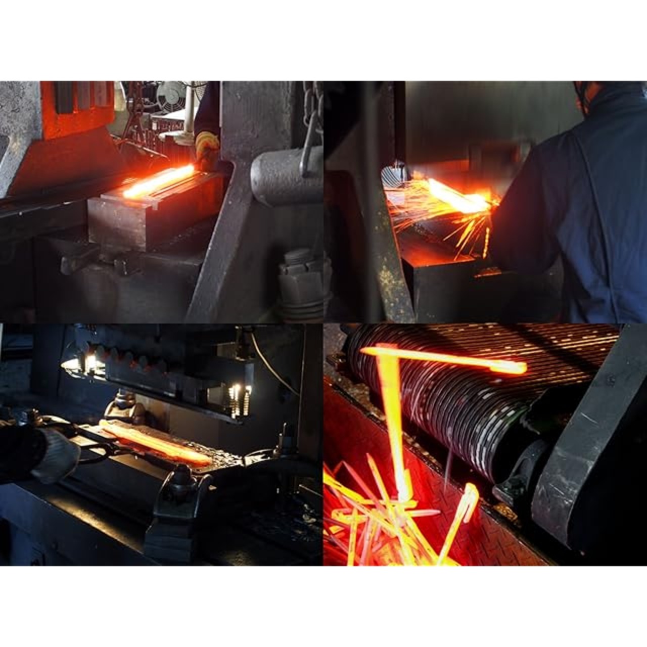 素材の丸い鋼材を約1100℃になるまで真っ赤に熱し、約1トンという強力な力で一気に断面を楕円形に潰した鍛造ペグ。熱した鋼材に強力な圧力を加えることによって、優れた強度を持つペグが完成します。