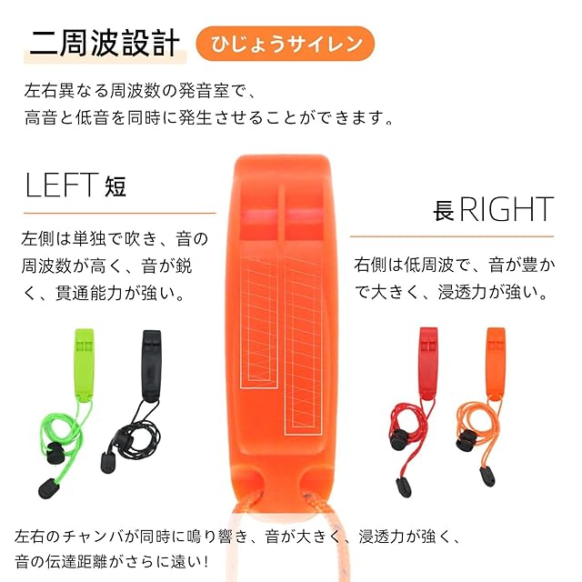 【二重周波数と大音量】ダブルチューブの緊急時用ホイッスル。左側と右側の異なる周波数の発音室は、同時に高音と低音を生成します。左右同時に吹き鳴らすと最高120デシベルに達する。