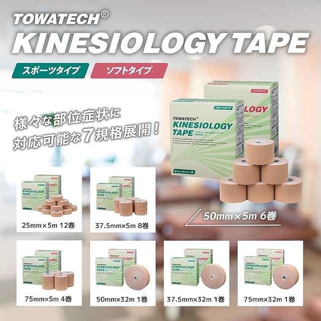 トワテックキネシオロジーテープは自社開発商品のため品質を落とさず、お求めやすいお値段でご提供しております。 より通気性に優れたソフトタイプと激しい動きでも剥がれにくいスポーツタイプをご用意していますので、肌質やシチュエーション、目的などに合わせてお選びいただけます。