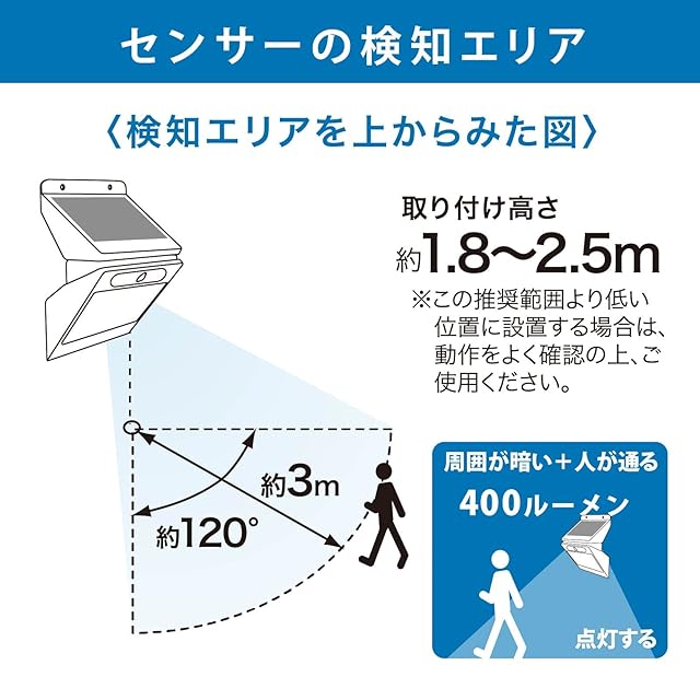 【 特 長 】● 太陽光で充電、赤外線センサーで人を検知しライトが点灯します● 明暗センサー+人感センサーで周囲が暗いとき人が侵入すると点灯します(周囲が明るいときは点灯しません)● センサー400ルーメン/常時点灯(強)200ルーメン/常時点灯(弱)100ルーメン/常夜灯10ルーメンの4つのセンサーモード