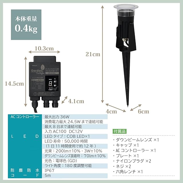 【本体仕様】ライト部分サイズ:6×6×12㎝/ライト重量:400g/変圧器:10.3×14.5×4.1㎝/変圧器重量:700g/材質:アルミニウム、ガラス/コード長さ:5m/AC100V側のコード長:0.6m/付属品:ガーデンライト本体×1、ダウンビームレンズ×1、キャップ×1、ACコントローラー×1、プレート×1、ナイロンプラグ×2、ネジ×2、六角レンチ×1/屋外用PSE認証取得済み/消費電力最大24.5Wまで連結可能(※最大8台まで連結可能)/入力:AC100、DC12V/自動点灯、自動消灯、時間消灯、常時点灯、常時消灯を切替可能