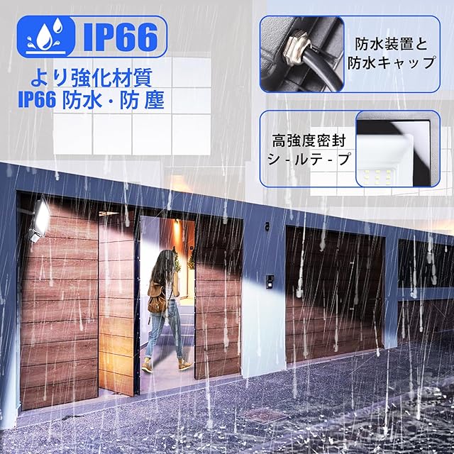 【防水性】密封されたシリコンコーキングを強化して、改良された防水グレードを昇級して、もっと良いのIP66防水レベルを実現します。屋外でも安心でご利用いただけます。LED投光器は雨の日も使用できるが、水の中に浸すことが禁止です。