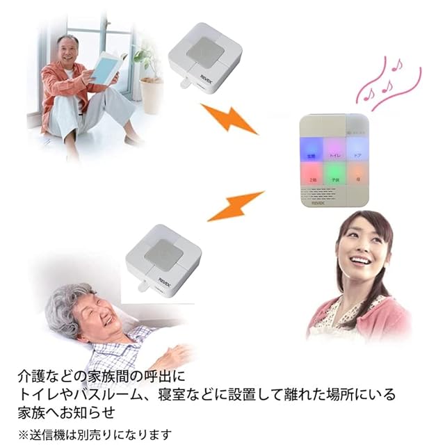 サイズ・重量(電池を含まない)(約):送信機7.7×8.3×3.5cm・82g 、受信チャイム/10.5×11.5×6cm・148g