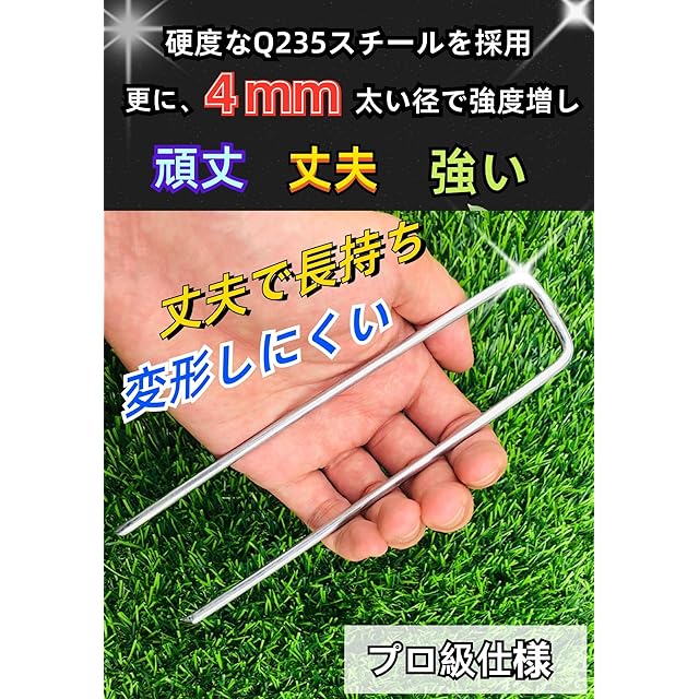 ●用途:人工芝、防草シート、農業用防虫ネット、マルチシートなどを地面に設置・固定できるU字型ピンです。
