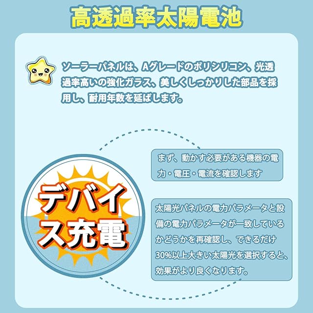 【多機能充電】このソーラーパネルは電圧が2Vで、様々な設備に適応することができます。電子機器の充電だけでなく、バッテリーや照明器具などにも電力を供給してくれるので、アウトドアでの生活をより便利にしてくれます。