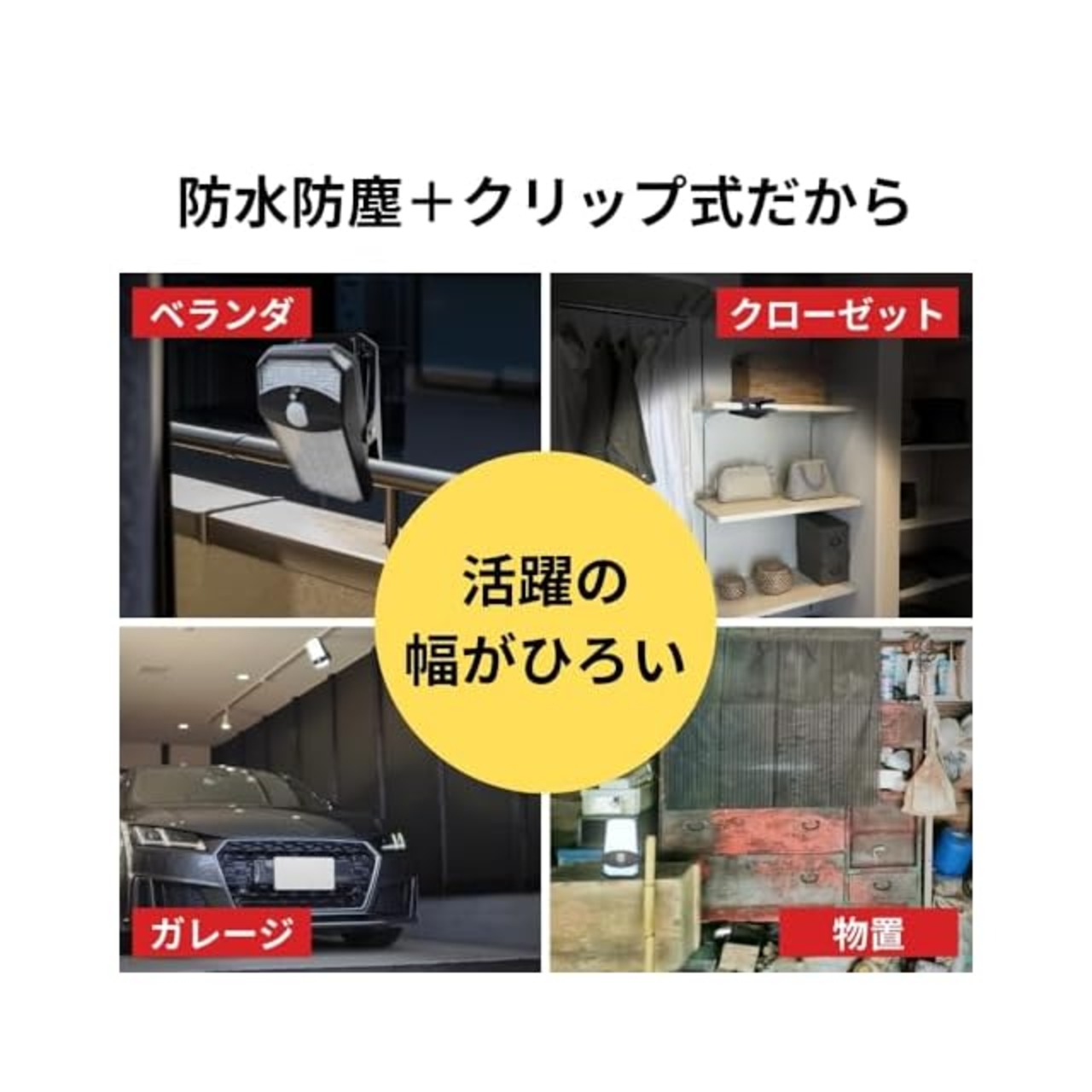 【どこにでも簡単設置】クリップみたいに挟むだけの簡単設置。太陽光で充電するソーラータイプで、電池不要。キャンプや釣りなどのアウトドアや、庭や玄関、駐車場の防犯用としても。必要な時、必要な場所へ明かりを持ち運べます。設置に工具が不要で付け替えもカンタン。【エコな太陽光発電】昼間はソーラーパネルで太陽光を効率的に充電、夜間は人感センサーで自動発光。ソーラーパネル一体型のスタイリッシュなクリップ式センサーライトで、ソーラーパネルとLEDが表裏構造なので、窓際で充電して、そのまま夜の室内を照らすことも可能です。