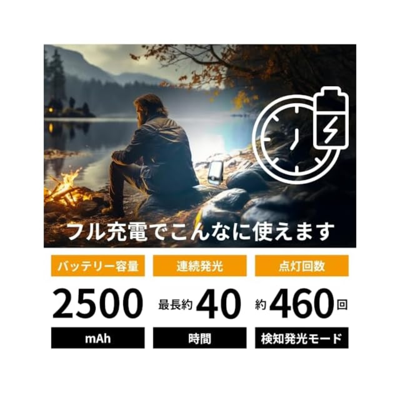 【モード切替アンサーバック機能付き】ボタン1回押し常夜灯+人感モード。ボタン2回押し人感モード。ボタン3回押し常夜灯モード。ボタン4回押し電源OFF【3つの点灯モード】(常夜灯+人感モード)周囲が暗くなると、常夜灯として弱発光。人を検知すると強発光。15秒後に常夜灯発行に戻ります。(人感モード)周囲が暗くなっても発光しません。人を検知すると強発光し15秒後に消灯。(常夜灯モード)周囲が暗くなると常夜灯として弱発光。センサーは作動せず、満充電で最長40時間連続発光。