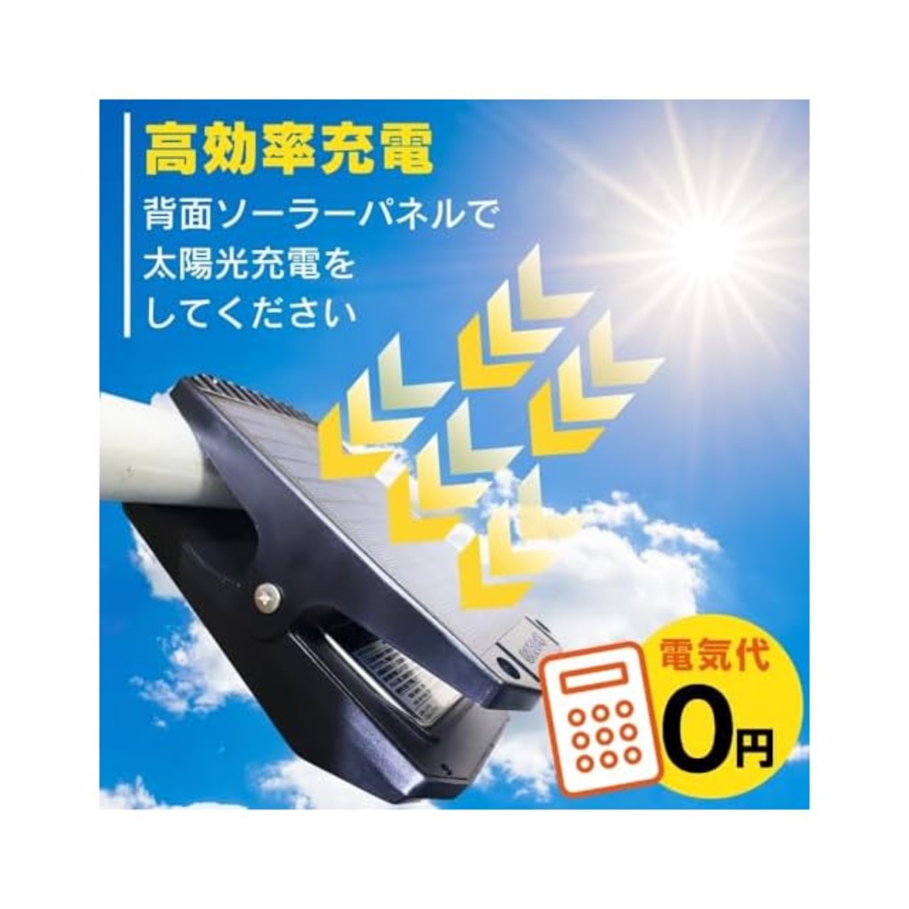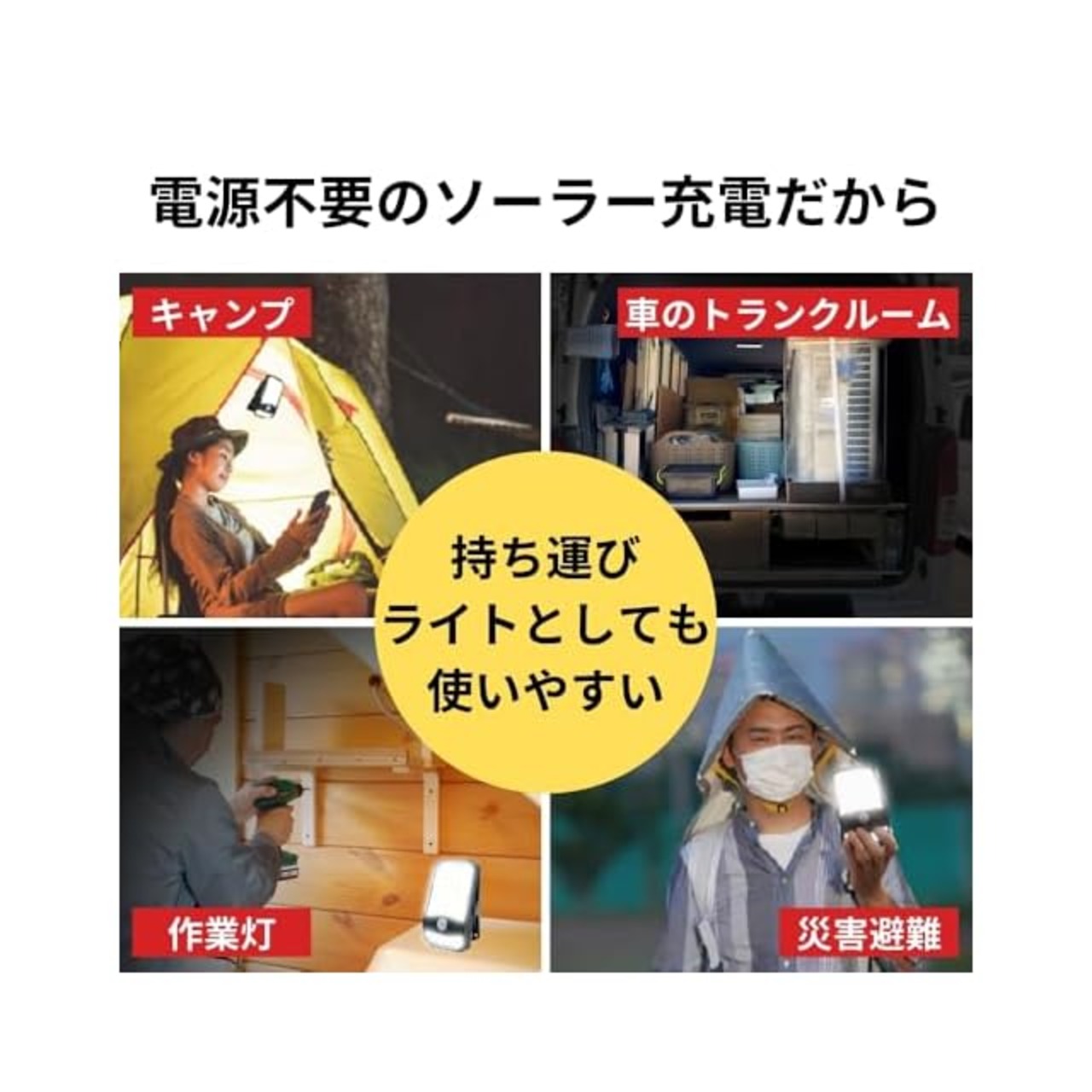 【3つの点灯モード】(常夜灯+人感モード)周囲が暗くなると、常夜灯として弱発光。人を検知すると強発光。15秒後に常夜灯発行に戻ります。(人感モード)周囲が暗くなっても発光しません。人を検知すると強発光し15秒後に消灯。(常夜灯モード)周囲が暗くなると常夜灯として弱発光。センサーは作動せず、満充電で最長40時間連続発光。【どこにでも簡単設置】クリップみたいに挟むだけの簡単設置。太陽光で充電するソーラータイプで、電池不要。キャンプや釣りなどのアウトドアや、庭や玄関、駐車場の防犯用としても。必要な時、必要な場所へ明かりを持ち運べます。設置に工具が不要で付け替えもカンタン。