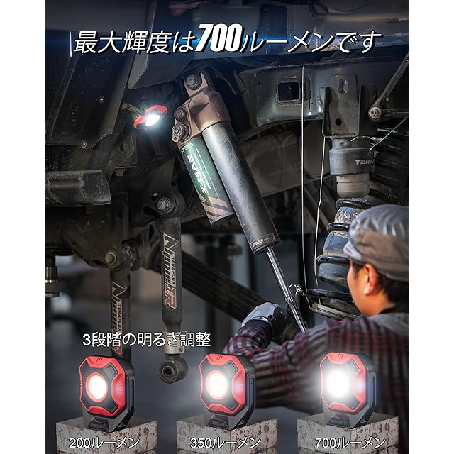 高輝度 LED 作業灯 & 3段階調光モード: 最大 700ルーメン の高輝度 LED を搭載し、暗所でもクリアな視認性を確保。200lm / 350lm / 700lm の 3つの照明モードを備え、シーンに合わせた明るさ調整が可能です。フル充電で 最長7時間連続使用 でき、車の整備、キャンプ、防災、夜間作業 など幅広く活躍します。