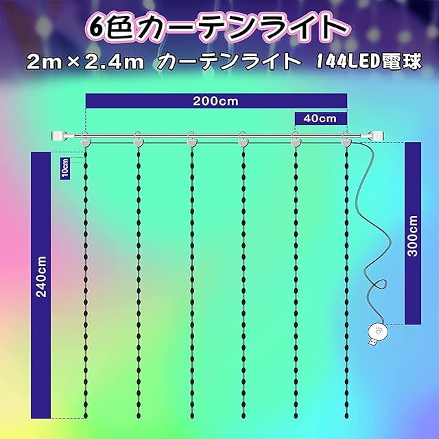 LEDイルミネーションライト カーテンライト 高輝度 柔光大粒子LED TPE超耐久性シース USB式 6本連結可能 多機能リモコン 屋外 室内 電飾 クリスマス/新年/結婚式/誕生日/祝日 2M*2.4M 144LED 6色 | SMILE