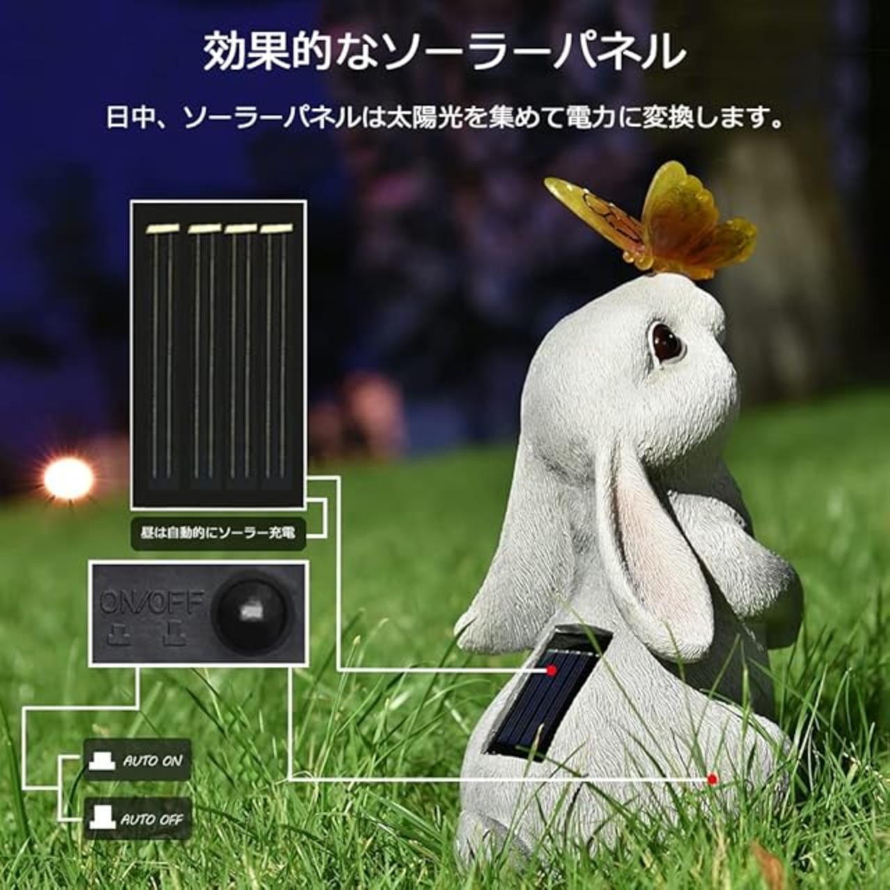 【愛らしいラビット】日中に自動的に太陽光を集めて、内蔵電池に蓄電しており、電気代がかかりません。表面には保護コーティングを備えて、雨や雪、直射日光ても心配ありません。樹脂も健康で環境に優しい材料であり、環境に優しいです。