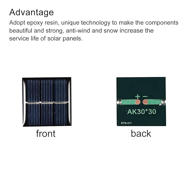 <br />これは何ですか?<br /><br />ミニソーラーパネルは多結晶シリコン製で、あらゆる種類の低電力電化製品、広告ライト、家庭用ライト、ソーラーウォーター ポンプなどの扇風機、小型ソーラーシステムに最適です。<br /><br /><br />私は何を手に入れますか?<br /><br />ミニソーラーパネルのサイズ:定格電圧:1.5V; 電流:60mA; パワー:0.09W; サイズ:30 mm x 30 mm<br />パッケージ内容:5 x ミニソーラーパネル<br /><br /><br />製品の利点はありますか?<br /><br />コンポーネントを美しく丈夫にする独自の技術であるエポキシ樹脂を採用し、風や雪を防ぎ、ソーラーパネルの耐用年数を延ばします。<br /><br /><br />どうやって使うのですか?<br /><br />ワイヤをソーラーパネルのプラスとマイナスに接続してから、ソーラーパネルを屋外に置き、太陽に逆らわせます。<br /><br /><br />何に注意すればよいですか?<br /><br />製品は太陽の下でのみ使用できます。公称電力は太陽のピーク、朝と夕方の太陽であり、強い日差しは公称に達していません。