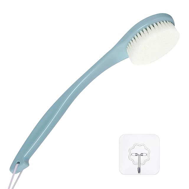 ROLIZOE 38cm長柄ボディブラシ ソフトブリッスルの背中ブラシ、エルゴノミックな曲線を描くプラスチックハンドルのバスブラシ、フックと紐つきの角質除去ボディスクラバー-ライトブルー