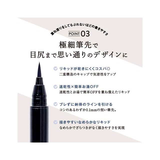 スッと書いて、落ちにくい。高耐久性×速乾性×簡単オフだから、忙しい方にもオススメの自信のリキッドアイライナーです。