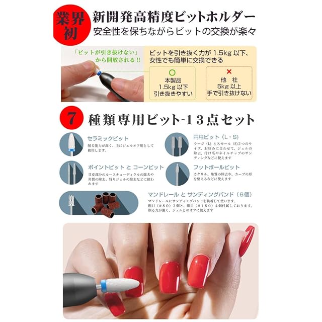 【新開発・人気ネイルリストが監修】より使いやすいネイルマシンを目指してプロのネイルリストの監修のもとで開発された電動ネイルマシン。総合ランキングナンバー1!海外でも大絶賛好評中!!ネイルオフの基本操作から自爪や甘皮処理などの指先のケアまで、この一本があれば十分!ビットの交換が楽々取扱説明書と見ればすぐに始められるため、初心者の方でも簡単にお使い頂けます。