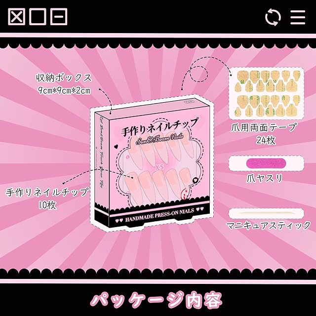 【内容】含まれているもの: 10枚のネイルチップ; 24枚の爪用両面テープ; 1つの爪やすり; 1つの木製キューティクルスティック; 1つの収納ボックス; ※最高の結果と再利用性のためには、Sun&Beam Nailsが販売するジェリーグルーの使用を推奨します。