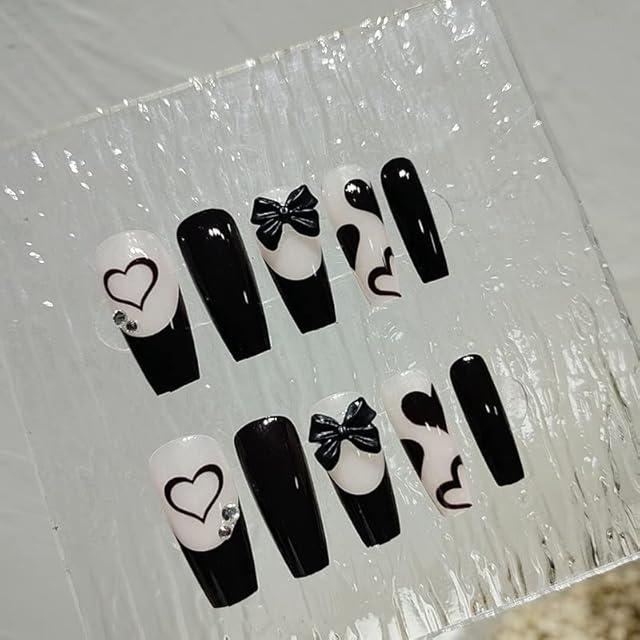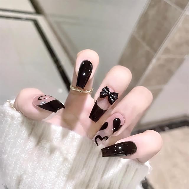 ネイルチップ つけ爪 ネイルプレスおしゃれ 黒 ショート 簡単オフネイル ビーズ 地雷系 韓国 量産型 コスプレネイル ネイルアート 可愛い レディース ネイルキラキラ 24枚入 おしゃれ 人気 女性 プレゼント セルフネイル 両面テープ48個付き (リボン) | SMILE