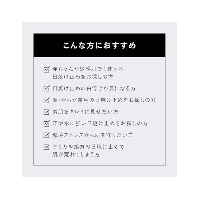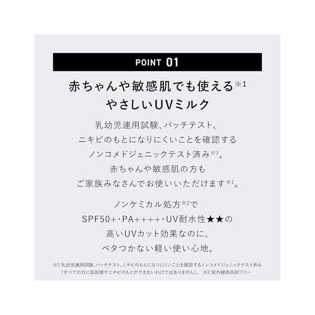 Product benefit: 耐水性×高SPF値×ノンケミカル処方の最強※UV商品が登場。汗や水に強いUV耐水性★★、ノンケミカル処方、SPF50+・PA++++なのに肌になじみ、軽いのにしっとりなめらか。ソフトフォーカスで凹凸を自然と補正し、肌をふんわりとなめらかに整えてくれます。