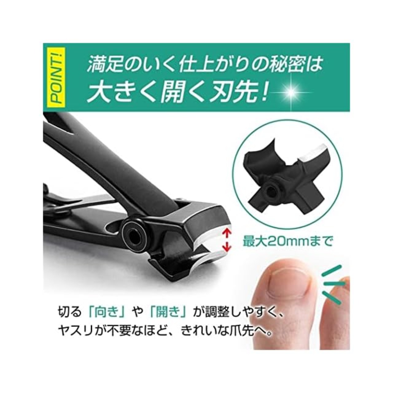 足の指などの厚い爪を切るのに適した大型爪切りです。 刃部分が大きく開くので、厚い爪も楽にカットできる構造の爪切りバサミです。