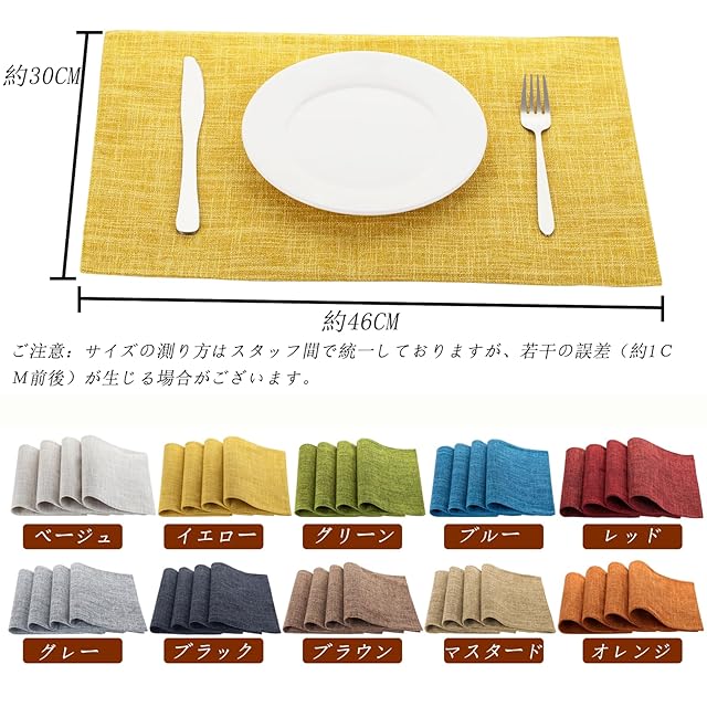 【サイズ&色】サイズ:約46cmx30cm、カラー:イエロー(4枚セット)、重量:71.7g/枚、材質:綿麻50%・ポリエステル50% 。布地製品ですので数ミリ程度の誤差がある場合がございますが、ご了承ください。