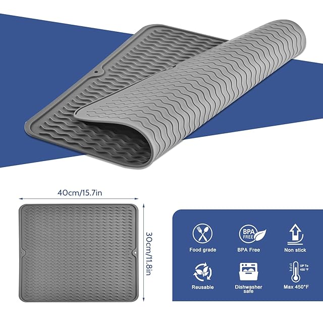 【環境に優しい】シリコン素材は健康的で環境にやさしく、長期皮膚と接触できます、匂いはゼロで、長期間使用しても色は変わりません。このキッチン食器乾燥マットはお手入れが簡単で、水で洗うだけです。