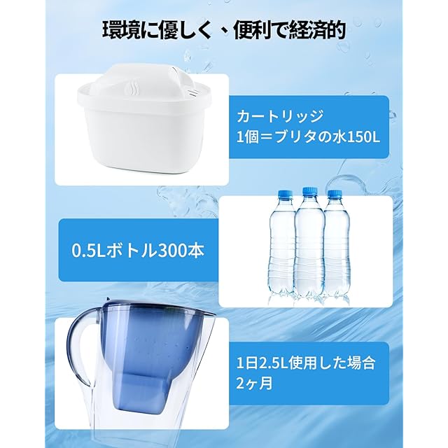 【経済的&環境へ配慮】カートリッジ1個で水150リットルろ過可能。1リットルあたり約4.5円と、とても経済的。1日2.5L使用した場合、カートリッジ交換時期の目安は約2ヶ月となります。