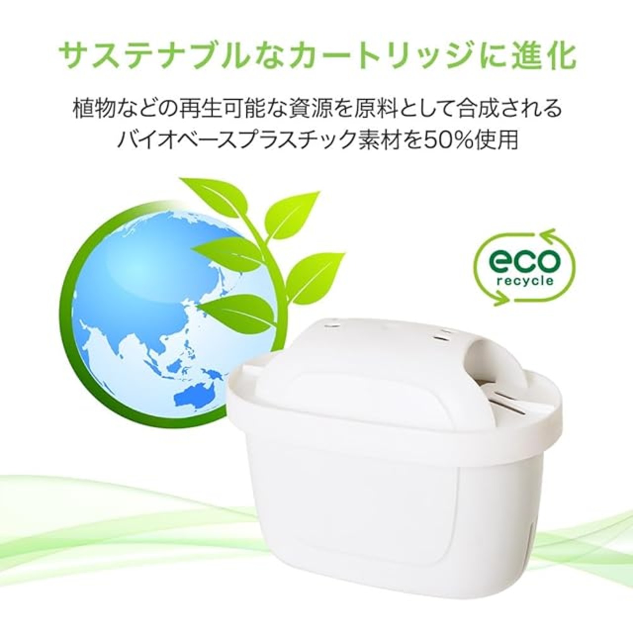 ろ材の活性炭が塩素や臭いのもとになる物質を除去。イオン交換樹脂が水の硬度を下げ、鉛や銅などの金属成分を除去。水アカを減少します。バイオベースプラスチック素材*を50%使用した、サステナブルなカートリッジ(マスバランス方式、ISCC+認証取得)