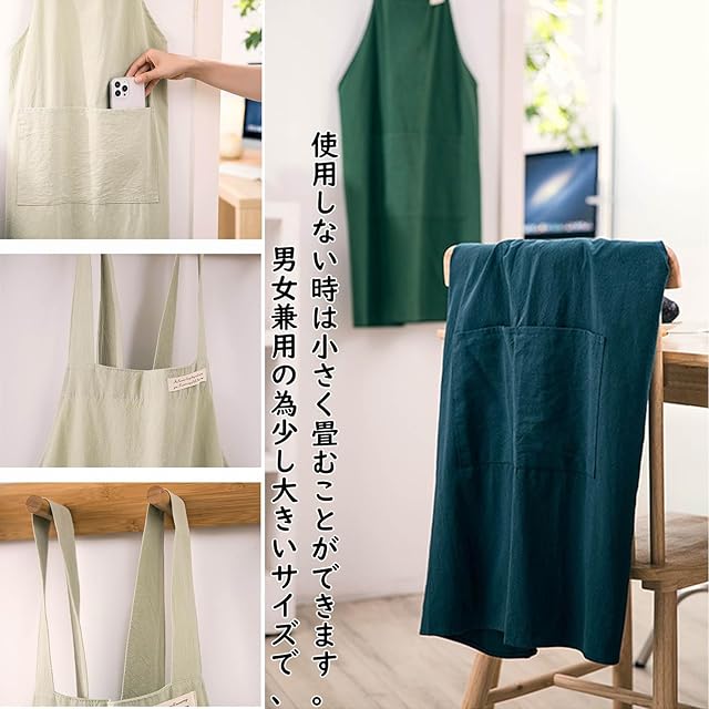 【エプロン ポケット付き】ポケットは重宝、ポケットがあるからエプロン。これらのポケットは、さまざまなガジェットや必要な小道具を収納するのに便利で実用的です。男女兼用の為少し大きいサイズで、下から首腕を通すだけで大丈夫紐があるタイプとは違い使いやすいです。肩部分が幅広なのでずり落ちにくく、何よりも軽いので一日中使っても肩こりしにくくなり。また、使用しない時は小さく畳むことができます。