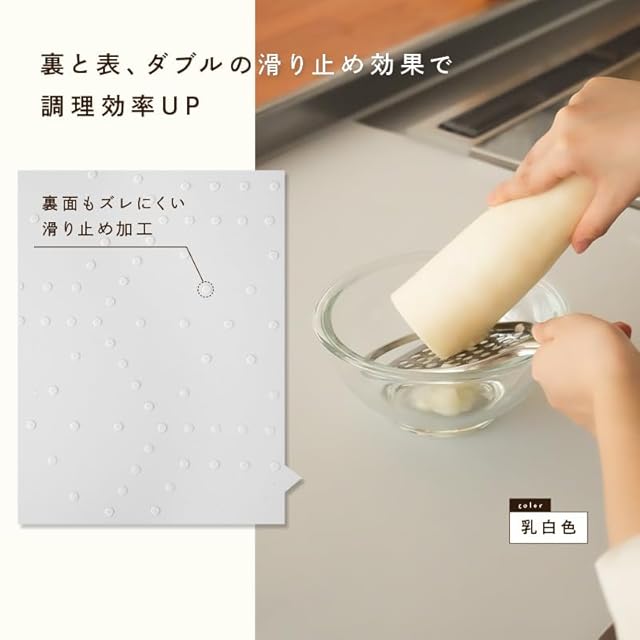 【ポイント②】食器や調理道具のガチャガチャ音を軽減!キッチンで作業するときに気になる音を軽減します。また、裏表どちらにも滑り止めが付いているため調理効率もUP!ボウルが滑って混ぜにくい…食器を置く音が気になる…など台所でのお悩みを解決します。