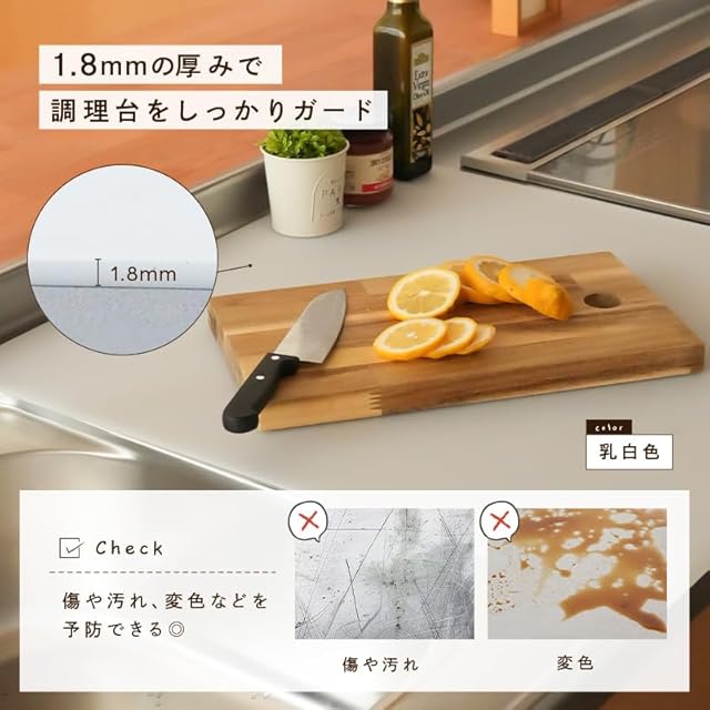 【ポイント①】1.8mmのシリコンマットが調理台をしっかりガード。お料理や作業をする前にさっと敷くだけで傷や汚れ、変色を防ぎます。230℃まで耐熱なので調理後の熱いお鍋を置くことも可能です。ハサミやカッターでお好みのサイズにカットできるので、ご自宅のキッチンに合わせてお使いいただけます。