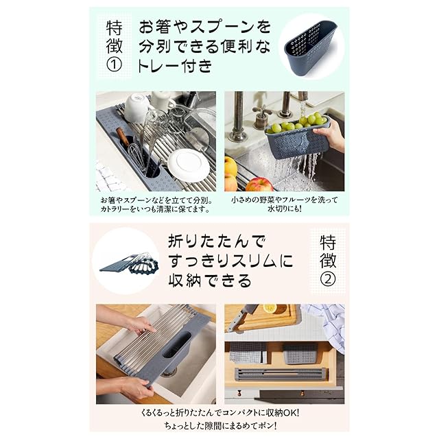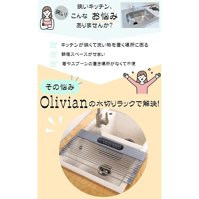 Olivian 水切りラック 丸めてコンパクト収納 水切りマット キッチン 水切りかご 便利 スリム おしゃれ シンク上 箸 スプーン コンパクト ステンレス 折りたたみ 一人暮らし 食器 かご付き (51×28cm, ブラック)